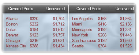 A Coverstar cover system can save you up to 70% on pool heating costs. According to the U.S. Department of Energy, a pool cover is the best way to reduce heat loss and save on your pool’s energy bill. Typical heating bills for pools to 78 degrees* in various parts of the country with and without a pool cover are shown below. Savings are even more dramatic at higher pool temperatures. In fact, just one pound of 82 degree water lost to evaporation takes a whopping 1,048 Btu of heat out of a pool.